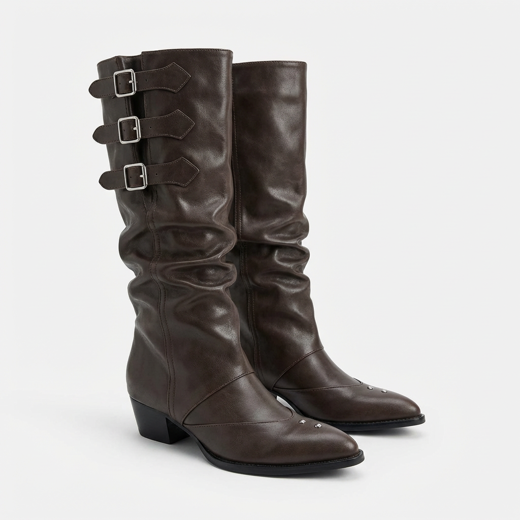 Les bottes Camille affichent un caractère affirmé grâce à leurs boucles décoratives et leur teinte marron profonde. Leur talon stable assure confort et élégance au quotidien.