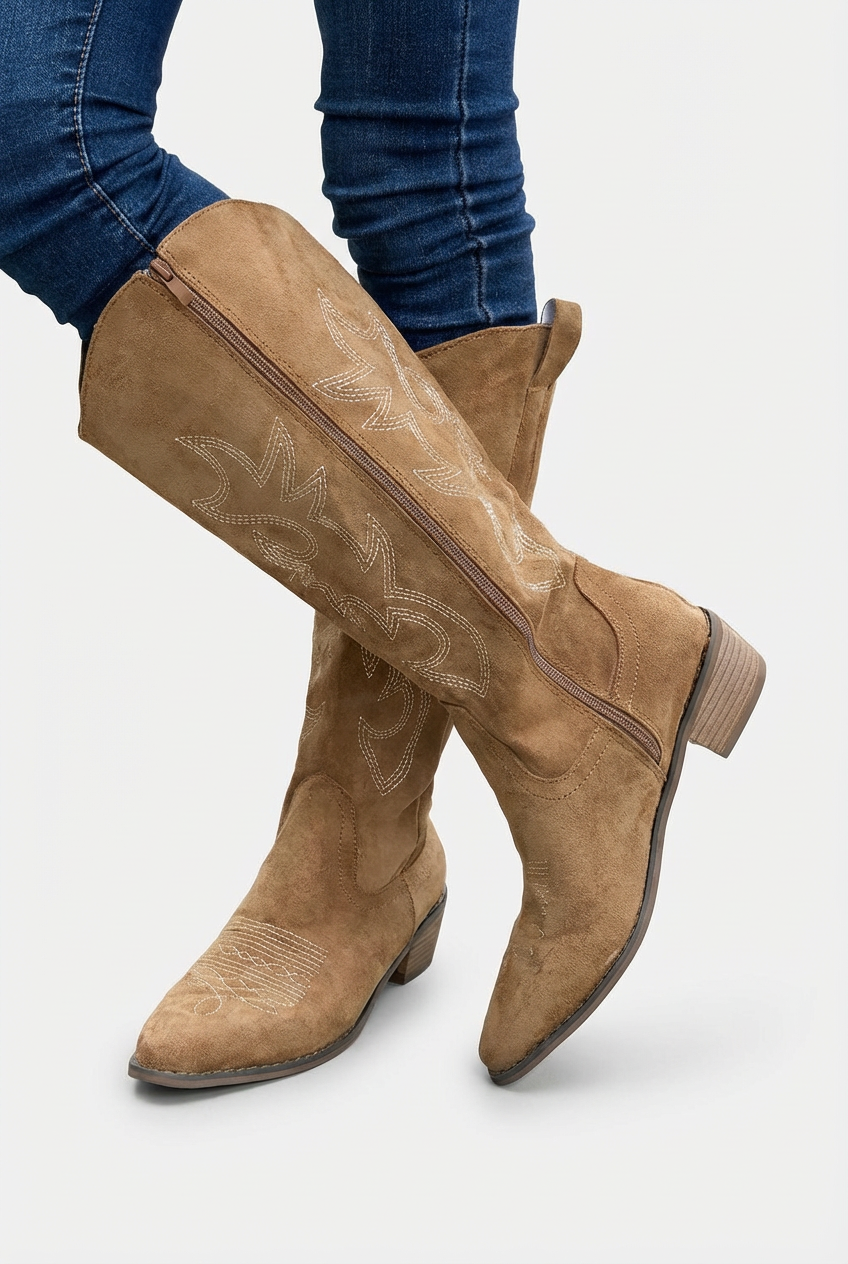 Ava – Santiag en Daim Camel Brodée Style Cowboy